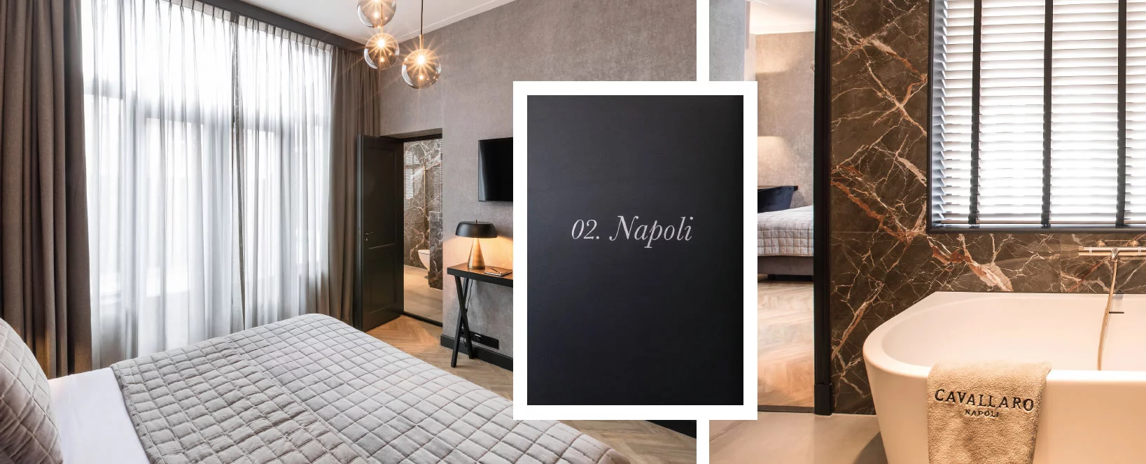 De Napoli-kamer biedt ruimte, privacy en eindeloos comfort. Gelegen op de eerste verdieping, met kitchenette en eigen terras, is deze kamer de perfecte uitvalsbasis voor een stedentrip of lang verblijf.